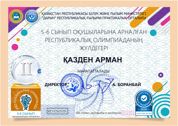 Ағылшын тілі пәнінен «Жас дарын» мамандандырылған мектебінің 5 сынып оқушысы Қазден АрманІІ дәрежелі дипломымен марапатталды.
