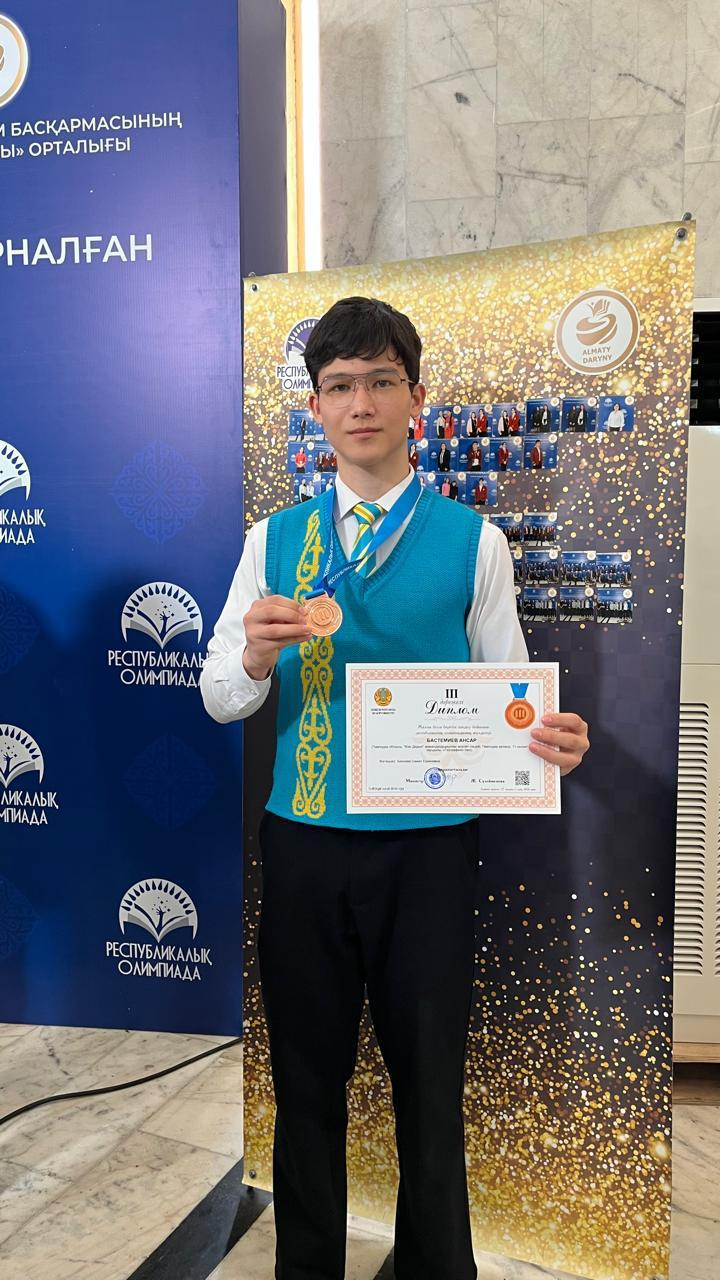 Алматы қаласында 2026 жылғы 27 наурыз – 01 сәуір аралығында 9-11(12) сынып оқушылары арасында география және химия пәндерінен республикалық олимпиадасы қорытындысы бойынша:Бастемиев Ансар-🥉3-орын. Жетекшісі: Баянова С.Е. Сәуір 1, 2026 Сәуір 2, 2026