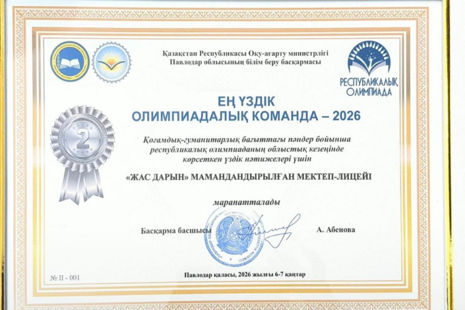 2026 жылғы 6-8 қаңтар аралығында өткен жалпы білім беретін пәндерден Республикалық олимпиаданың облыстық кезеңінде лицейіміздің командасы қоғамдық-гуманитарлық бағытында ІІ орынға ие болып, “Үздік олимпиадалық команда” атанды!Қаңтар 8, 2026Наурыз 16, 2026