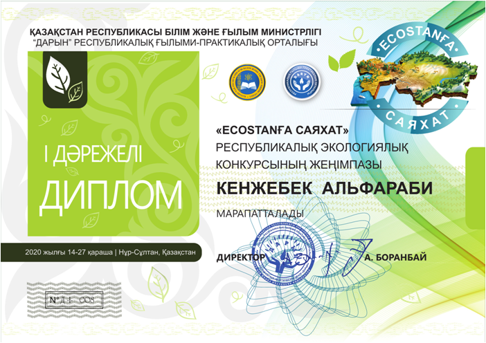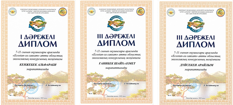 Облыстық кезеңінің нәтижесі бойынша 10-«А» сынып оқушысы Кенжебек Әлфараби «Ең үздік экологиялық бейнебаян» бағытында I орынға ие болып, республикалық кезеңге жолдама алды (жетекшісі Баянова С.Е.). Сонымен қатар  8-сынып оқушысы Шай-Ахмет Ғанибек, 9-сынып оқушысы Дүйсекен Арайлым III жүлделі орындарды иеленді.