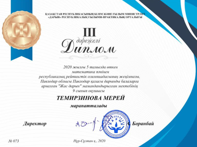 2020 жылы 5 тамыз күні  математика пәнінен Республикалық  рейтингтік олимпиадасында 9 сынып оқушысы Темирзинова Мерей  ІІІ диплом жеңімпазы атанды.