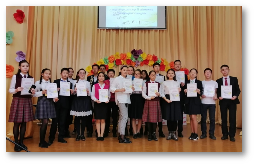 “Менің кіші Отаным” ІІ республикиқ интеллектуалдық конкурсың облыстық кезеңі 4 бағ бойытынша өтті: «Менің кішкентай Отаным тарихыаша», «Кішкентай Отанымның символы», «Менің кішантай Сайыс нәтижесінде 9 сынып оқушысы Ахмади Мағжан 2 орынмен, 10 сынып оқушысы Рахимбердина Аружан 3 орынмен марапатталды.