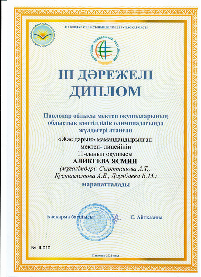 2022 жылғы 18 қараша күні «Ертіс дарыны» өңірлік қосымша білім беру оқу-әдістемелік орталығы Торайғыров университетімен бірлесіп, «Торайғыров университеті» КЕАҚ негізінде облыстық көптілділік олимпиадасын өткізеді.Қатысушылар тапсырмаларды қазақ, орыс және бір шетел тілде орындады. 11 сынып оқушысы Аликеева Ясмин мен 10 сынып оқушысы Қапен Жамиля шетел тілден ағылшын тілін таңдаса, 9 сынып оқушысы Ахметова Риза француз тілінен қабілеті барын дәлелдеді. Олимпиада нәтижесінде Аликеева Я. Қапен Ж. Ахметова Р. 3 орынға иеленді.