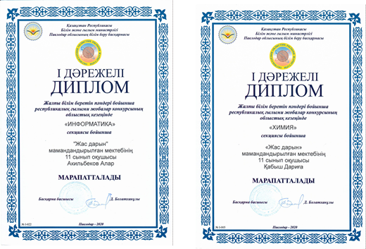 І орында 11сынып оқушылары секция химия Қабыш Д. (жетекшісі Қалым Г.М.), секция информатика Акильбеков А. (жетекшісі Шайхимов А.А).