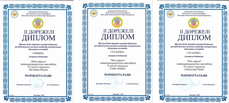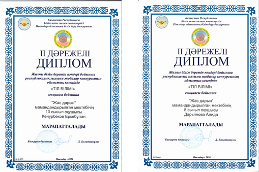 ІІ орында 3жоба:  секция химия 10сынып оқушысы  Кастаева Ж. (жетекшісі Алибеков М.С.)., командалық жұмыстартіл білімі (ағылшын тілі) секциясы 10сынып оқушылары Смагулова Р. Мен Кенурбеков Е. (жетекшісі Ильясова Г.Р.); секциятіл білімі (қазақ тілі) 8 сынып оқушыларыДарьянова А. менСовет И. (жетекшісі Аханбаева С.Е.).