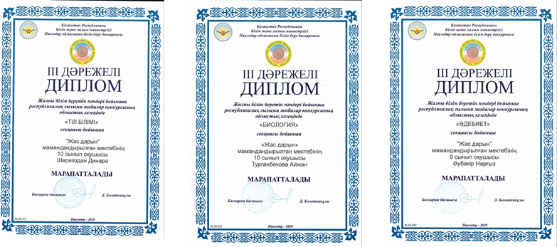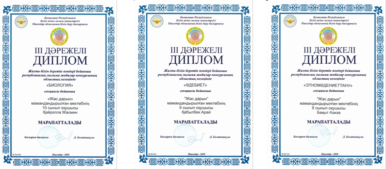 ІІІ орында 4 жоба: секция этномәдениеттану 8 сынып оқушысы Бақыт А. (жетекшісі Қалым Г.М.), секция тіл білімі (ағылшын тілі)10сынып оқушысы  Шерияздан Д. (жетекшісі Ильясова Г.Р.), командалық жұмыстар секция биология  10сынып оқушылары Турганбекова А. мен Қайролла Ж. (жетекшісі Қисап А.С.);, секция  әдебиет  (қазақ) 9 сынып оқушылары Қабылбек А. мен Әубакір Н. (жетекшісі Сырттанова А.Т.).