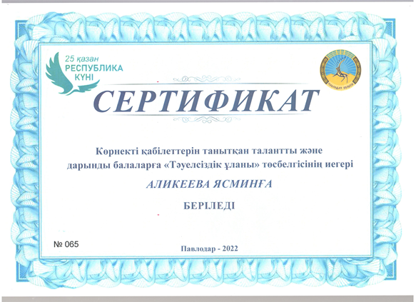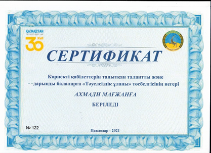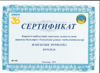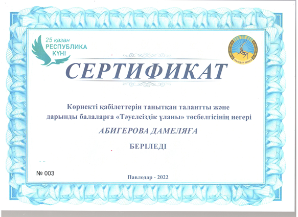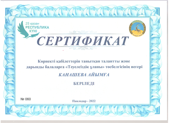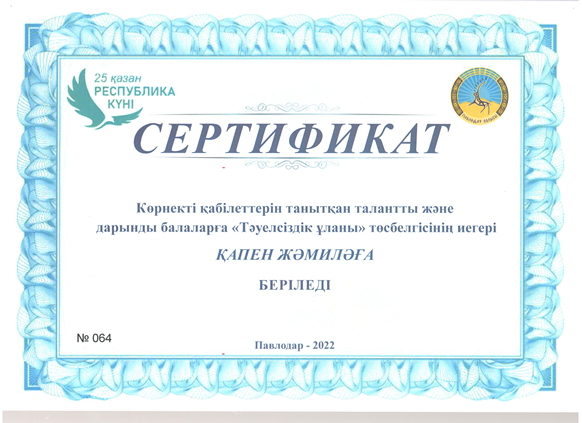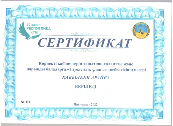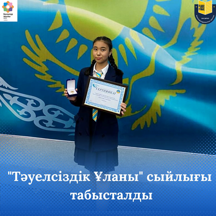 Тәуелсіздік ұланы Ақпан 20, 2023 Ақпан 20, 2026 2022-2023 оқу жылы2021-2022 оқу жылыҒылыми-техникалық шығармашылық және оқу-зерттеу қызметі номинациясы«Спорт шеберлік» номинациясы «Шығармашылық шеберлік» номинациясы