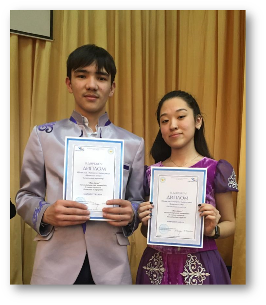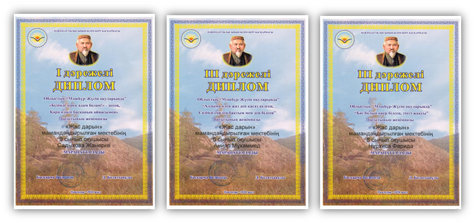 - XIV облыстық Мұқағали Мақатаев оқуларында 10 сынып оқушысы Ахын Балжан Құрмет грамотасымен