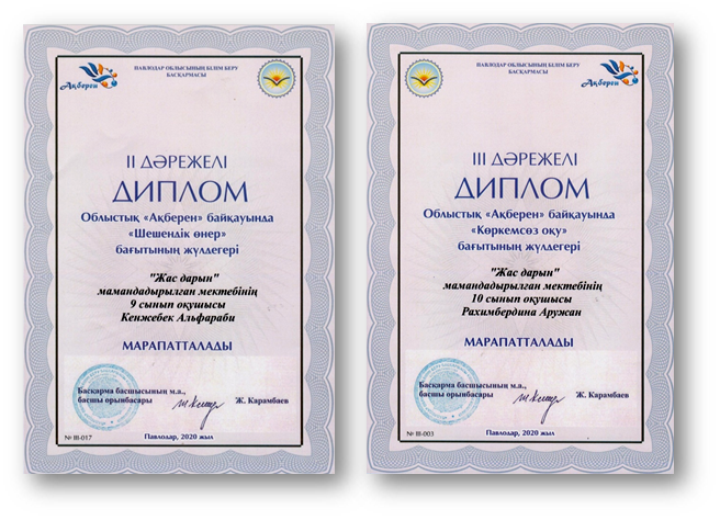 - “Ақберен” Республикалық байқауының облыстық кезеңінде 9 сынып оқушысы Кенжебек Альфараби«Шешендік өнер»номинацияда 2 орынмен, 10 сынып оқушысы Рахимбердина Аружан «Көркем сөз оқу» номинацияда 3 орынмен