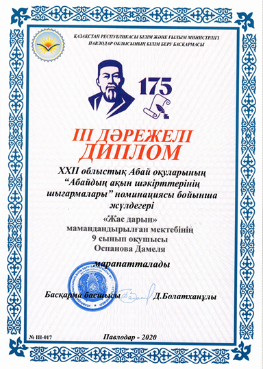 10 қараша күні «Ертіс дарыны» орталығының ұйымдастыруымен XXII облыстық Абай оқулары қашықтықтан өткізілді. «Абайдың ақын шәкірттерінің шығармалары» бағыты бойынша 9- «Ә» сынып оқушысы Оспанова Дамеля Шәкәрім Құдайбердіұлының «Аңда жүріп шөлдеген Ашам патса» поэмасын мәнерлеп жатқа оқып, 3-орынды иеленді. Құттықтаймыз!