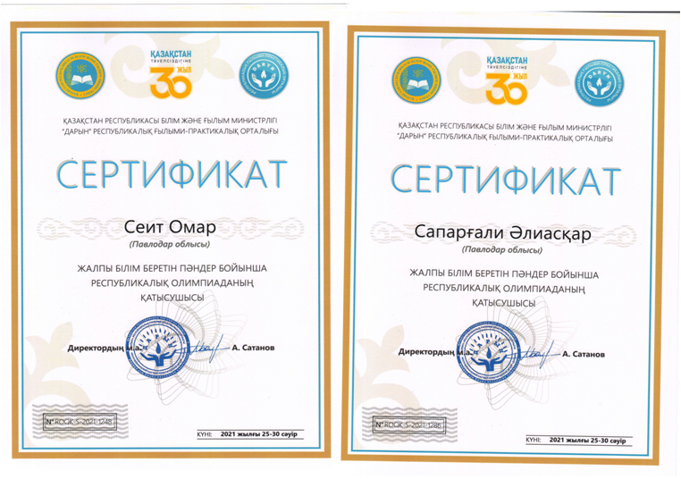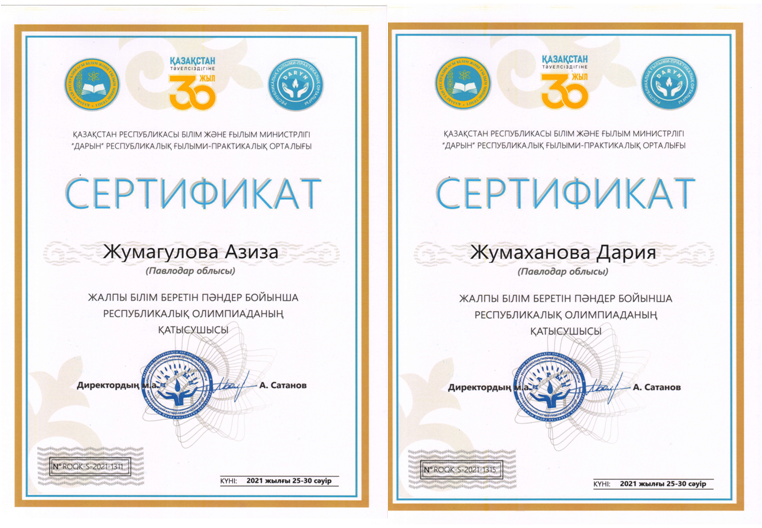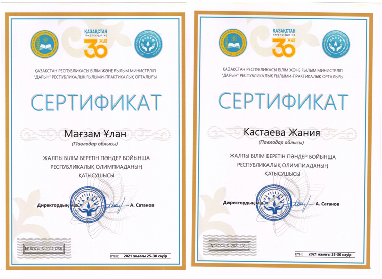2020-2021 оқу жылы  жалпы білім беретін пәндер бойынша Республикалық олимпиадасының қорытынды кезеңі ағымдағы жылғы 25-30 сәуір аралығында «Ustudy» орталықтарының негізінде өткізілді. Республикалық олимпиадаға Павлодар облысынан  91 оқушы қатысты, оның ішінде 16 оқушы «Жас дарын» мамандандырылған мектебінен.