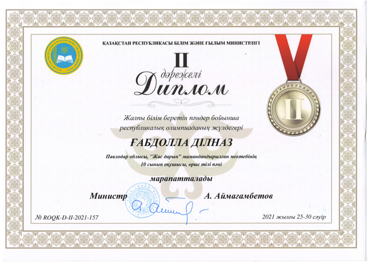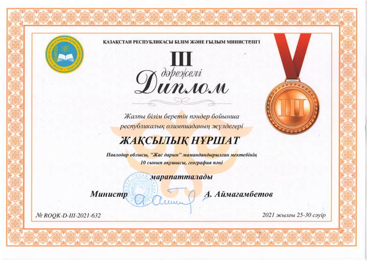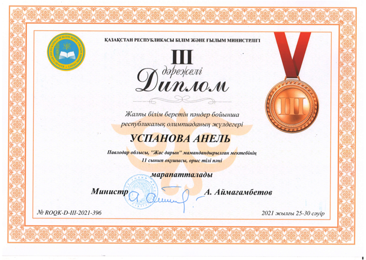 Олимпиада  қорытындысында  мектеп оқушылары  6 медальға  ие болды:   алтын медаль- Қазақстан тарихы пәнінен 10-сынып оқушысы Ахмади Мағжан   (мұғ.Какабаева А.М. ), француз  тілінен  10-сынып оқушысы Бисмельдинова Карима (мұғ.Батаева Қ.К.). Күміс медельге иеленді  орыс тілінен 10-сынып оқушысы Ғабдолла Ділназ (мұғ.Бегежанова А.Е. ). Қола медальдармен марапатталды математика пәнінен 10-сынып оқушысы Темирзинова  Мерей (мұғ.Текенов А.А.),  орыс тілінен  11 -сынып оқушысы Успанова Анель (мұғ.Куставлетова А.Б.), география пәнінен 10- сынып оқушысы  Жақсылық   Нұршат(мұғ.Кайдарова Л.С.).